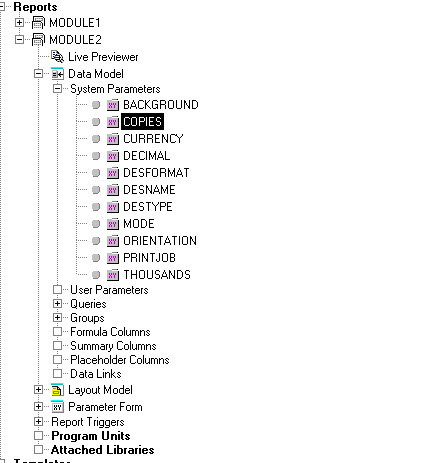 بتاريخ: 5 يناير 201214 سنة comment_219354 السلام عليكمكلام سليم وبامكانك اضافة عدد النسخ كـ Parameter لكي تستيطع تحديد عدد النسخ وان تكون غير مقيد بالعدد 100: ADD_parameter(pl_id,'copies',TEXT_parameter,:control.Qty2Print); بالتوفيق. تقديم بلاغ