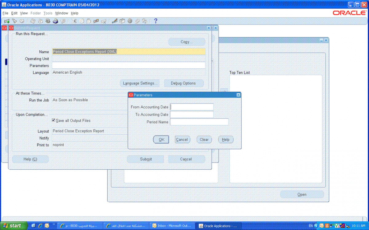 بتاريخ: 8 أبريل 201213 سنة comment_222892 مرحباشوف القيود العالقة على GL InterfacePayables Manager -> Requests ->submit new request -> single request -> "Period Close Exceptios Report" تم تعديل 8 أبريل 201213 سنة بواسطة ORA-2008 تقديم بلاغ