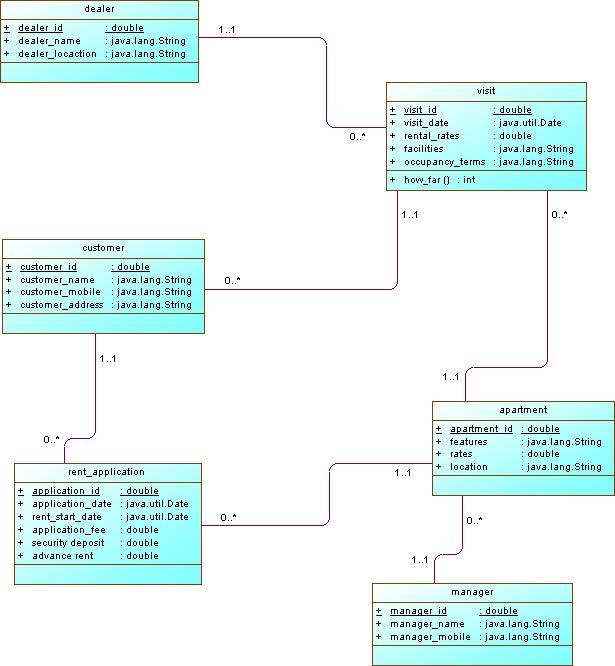 بتاريخ: 26 أبريل 201213 سنة comment_223735 السلام عليكم ,, لو سمحتوآ أحتاج مساعدتكم في حل هذا السؤال ,,عجزت افهمه وأعرف كيف أبدأ أرسمه بالبرنامج << السبب محد شرح لي طريقة الرسم وكيف افكك السؤال وأحتاج الحل في أسرع وقت ,,تكفووون إللي عنده خبرة بهالشي لايحرمني من مساعدته ,,أنتظركم ,,هذآ السؤآل : http://up.arab-x.com/Mar12/3Ft88665.jpgاذا الصورة مش وآضح هذا السؤآل ’’Read the given scenario for “Renting an Apartment” carefully & Draw the class diagram for it.1) The ******er goes to the property dealer and finds the apartment unit he likes. By exploring the features, rates, and locations of the many apartment complexes available, he can narrow his ****** down to a short list of apartment homes he want to inspect in person.2) He makes visit of each apartment complex with the property dealer. He notes down how far it is from his place of work. Ask about the rental rates, facilities, and occupancy terms and conditions.3) When he has decided on which apartment he wants to rent, he fills out their application form with the property dealer. This is a formality which allows the manager of the apartment complex to check ******er’s identity. He may be required to pay an application fee at this time.4) He pays the security deposit and advance rent to the manager and signs the rental agreement with the manager in presence of the property dealer.5) Then the ******er and the manager pay the commission to the property dealer.6) The property dealer provides them a receipt and updates his file.7) The ******er gets the keys of the apartment from the property dealer.8) He moves into his apartment on the date he has agreed on with his belongings, and begins to enjoy his new home and community!Yellow highlighted are classes, red color text is showing relations and underlined are attributes and methods for classes.تكفوووووووووووووووون لاتحرموني من مساعدتكم ,, تقديم بلاغ