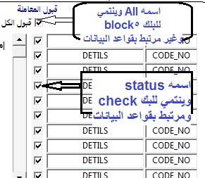 بتاريخ: 8 أبريل 201313 سنة comment_234715 طبعاً نحتاج بالبداية الى اضافة بلوك واداة تشك بوكس لهذا البلوك ولنسمي البلك block5 والاداة all اما البلك المرتبط بقواعد البيانات والذي يحتوي على اداة تشك بوكس مرتبطة بعمود نفترض ان اسم البلك check والاداة سوف يكون اسمها status والصورة في المرفقات توضح اكثر وبالتالي سوفغ يكون الكود التالي في حدث النقر على اداة التشك بوكس المسماه all go_block('check'); first_record; loop :check.status := :all; next_record; synchronize; exit when :system.last_record = 'TRUE'; end loop; :check.status := :all; والسلام عليكم ورحمة الله,,,,,,, فارس تم تعديل 8 أبريل 201313 سنة بواسطة Ahmad.Hasan تقديم بلاغ