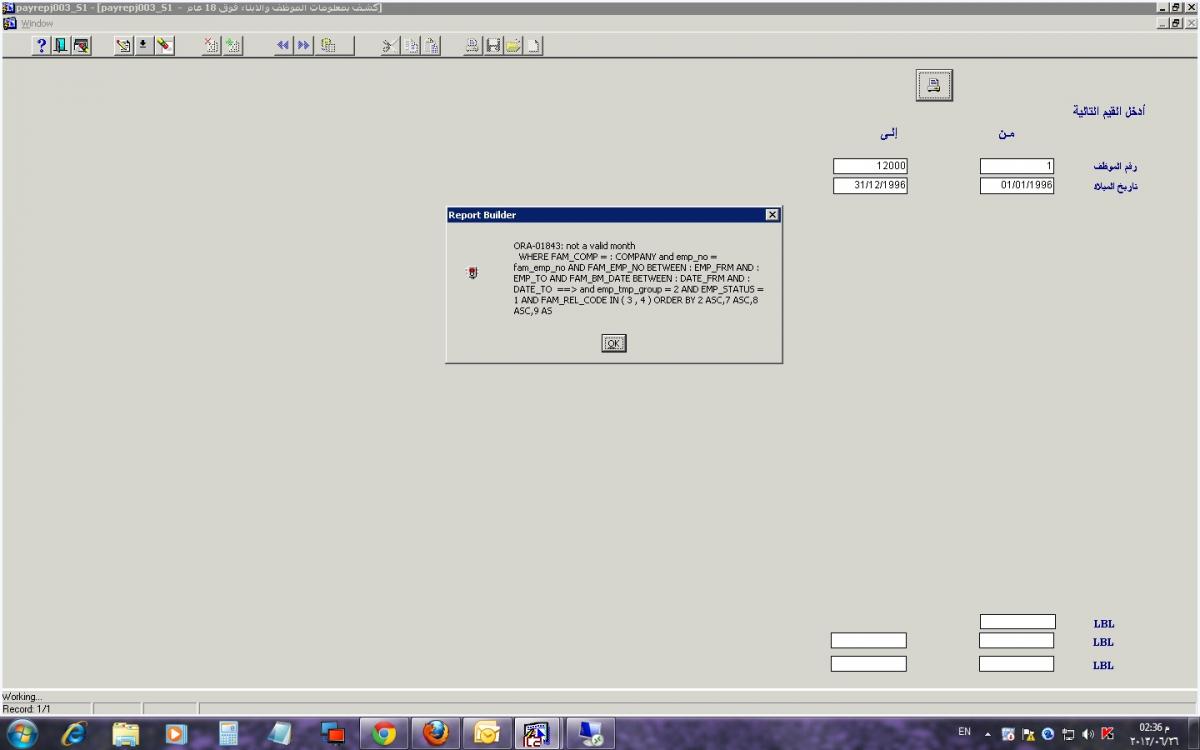 بتاريخ: 27 يونيو 201312 سنة comment_237990 سبب هذا الخطأ تنسيق التاريخ . لحل هذا الخطأ عدل الخاصية Format Mask لكل من العنصرين DATE_FRM و DATE_TO إلى DD/MM/YYYY لأن الإفتراضي قد يكون MM/DD/YYYY فعند إدخال القيمة 31/12/1996 يعتبر السيستم أن 31 هي الشهر و هذا غير صحيح . تقديم بلاغ