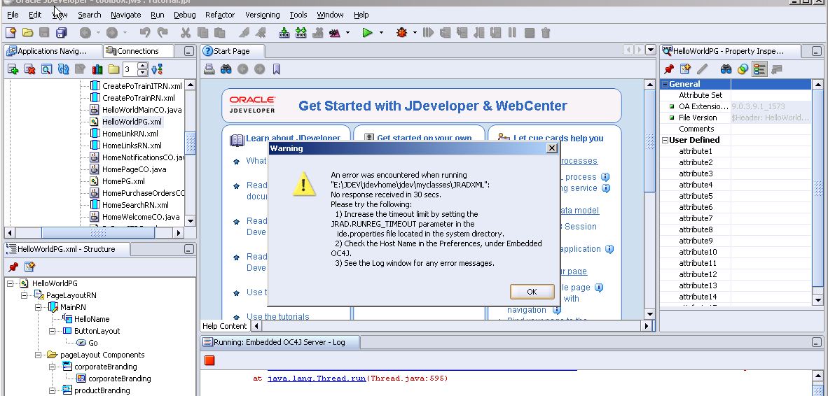بتاريخ: 12 أغسطس 201312 سنة comment_239147 شباب قمت بتنزيل ال JDeveloper وضبط الاعدادات اللازمة له وعندما قمت بتنفيذ اول صفحة وهيا تأتي بشكل تلقائي مع ال Jdeveloper وهي HellowWorld.xml ظهر لي المسج التالي المرفق في الصورة , قمت بالبحث عن حل المشكلة ولكن للاسف بدون فائدة ... هل من احد لديه اي اقتراحات او حلول وشكرا تقديم بلاغ