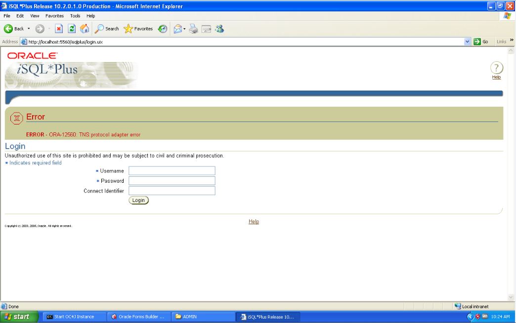 بتاريخ: 31 أغسطس 201312 سنة comment_239657 انا بستخدم أوراكل 10g عندي الاوراكل سيرفيز مش شغالة مش عارفة ليهبستخدم ويندوز اكس بي علي vmware أما آجي أدخل واكتب اليوزر والباسورد مش شغال وبيديني الرسالة دي هي في الصورة المرفقة تقديم بلاغ