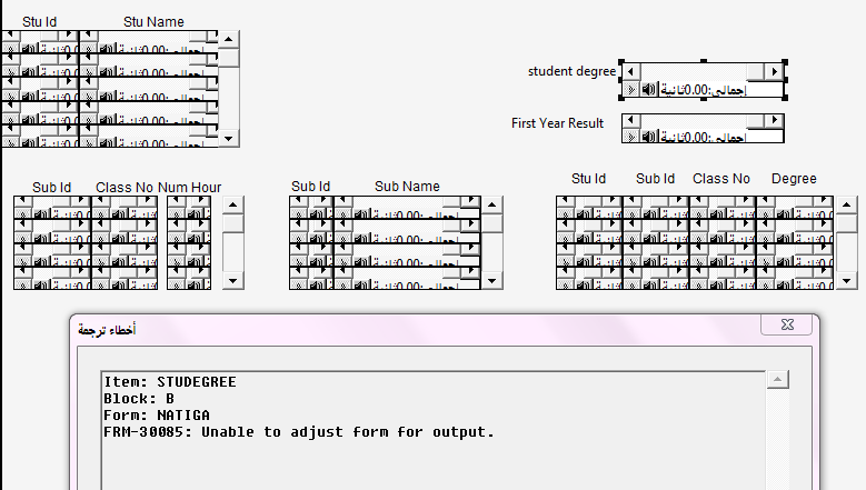 بتاريخ: 16 أكتوبر 201312 سنة comment_241186 الحاجة الوحيدة اللي عملتهالك هي نتيجة الطالب , لما تقف بالماوس علي اي رقم طالب هيظهرلك النتيجة في التكست ايتم اللي انت شايفه أدامك , بس دخل بيانات الاول للطالب رقم 1 و 2 و3 في جدول الـ result , انا دخلتلك اسماء طلاب 1 و 2 و 3 , بس انت عليك تدخلهم نتائج . بص عليهم بقى الاول وعلي اسمائهم عشان تدخلهم في جدول الـ result . 2- لو انت عاوز تسجل بيانات بس في الجدول فدي مش تاسك ولا حاجة , انت اعمل بلوك مبني علي الجدول ودخل بيانات بايدك , ده اللي انا فهمته منك . 3- مينفعش اجبلك نتيجة اي حد في السمستر الاول والتاني لان انت اصلا معندكش اي تفاصيل عن السمستر في اي جدول معلش لو فهمت غلط , انت قلت في رقم 2 الفصل فانا فهمت ان هو الـ class , وفي 3 جبت سيرة السمستر فانا فهمت ان الصف هو السمستر , انت اللي مش محدد بقى ملحوظة : حاولت ارفعلك الفورمه , بيقولي غير مسموح برفع هذا النوع من الملفات : المهم : انت هتعمل بلوك مبني علي جدول الـ stu , وتعمل تكست ايتم وتعمل تريجر when-new-item-instance وتكتب فيه الاتي : select degree into :stu_degree from resultwhere stu_id = :stu.stu_id ; تم تعديل 16 أكتوبر 201312 سنة بواسطة eslam elbyaly تقديم بلاغ