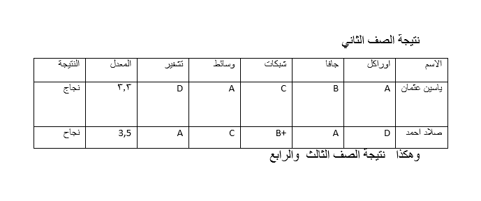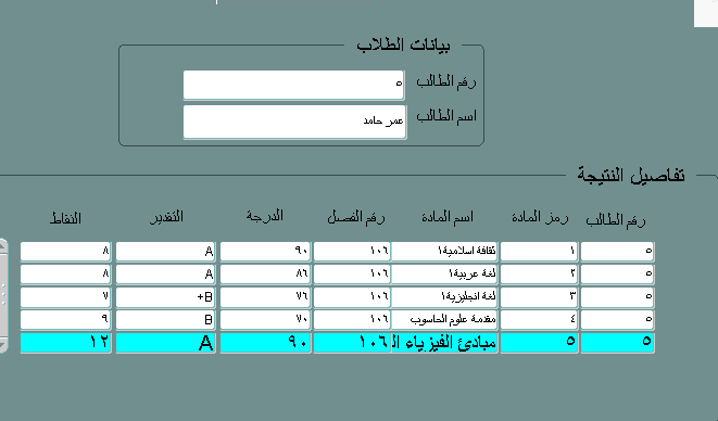 بتاريخ: 18 نوفمبر 201312 سنة كاتب الموضوع comment_242943 هذه صورة من الجداول منفذة الاعمدة المطلوب ظهورها موضحة في الصورتين الصورة الاولى تقرير لطالب في كل الفصول وتتكون من(المقررsub_name , الساعاتnum_hour , الدرجةdegree , التقديرgrade , النقاط point , المعدل الفصلي والتراكمي هو عملية حسابية = مجموع عدد النقاط/مجموع عدد الساعات في الفصل) الصورة الثانية تقرير للطلاب في فصل معين وتتكون من (اسم المادة sub_name مثلا اوراكل , جافا ...................... اسم الطالب stu_name , التقدير grade مثلا A,B+,B,C ...............وهكذا) تقديم بلاغ