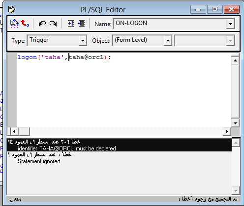 بتاريخ: 23 نوفمبر 201312 سنة comment_243247 هذا تصليح للخطأ logon('taha','taha@orcl'); ضع taha@orcl في single quotation تقديم بلاغ