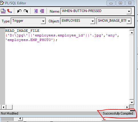 بتاريخ: 24 ديسمبر 201312 سنة comment_244586 انا اسف يا استاذ حسين ممكن الكود بيتكتب كده read_image_file('e:\'||:employees.employee_id||'.jpg','any','employees.emp_photo'); يعنى حط نقطتين فوق بعض عند ال employees.employee_id تقديم بلاغ