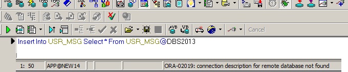 بتاريخ: 3 مارس 201412 سنة كاتب الموضوع comment_247314 بامكانك انشاء DB Link ومن ثم تنفيذ الجملة التالية (مع تغيير اسماء الجداول واسم DB Link): Insert Into Xxx Select * From Yyy@Db2 ------------------- لقد قمت بتنفيذ الأمر السابق ولكنها ظهرت لي الرسالة التالية ora-02019 connection description for remote database not found فما الحل تقديم بلاغ
