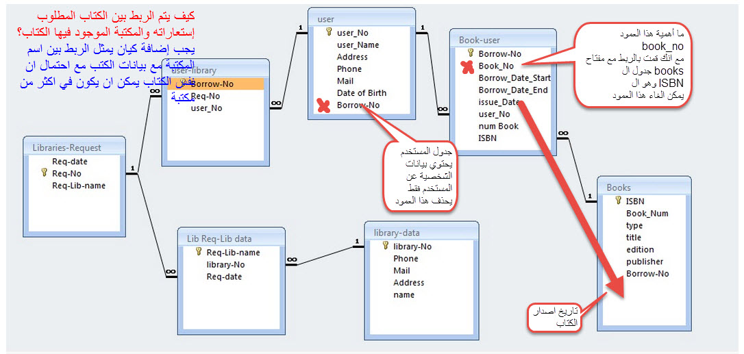 بتاريخ: 15 مايو 201411 سنة كاتب الموضوع comment_250609 السلام عليكم ... مشكور اخ امجد ما رايك لو عملت تغيير لاسم جدول ال laybary data وصار laybary مغ اضاقة حقل ال book num لة... وعملت ربط بين جدول ال book وحدول الـ laybary ..... يا ريت كمان توضح لي طريقة الربط بين الكتاب المطلوب والمكتبة الموجود بـها الكتاب تقديم بلاغ