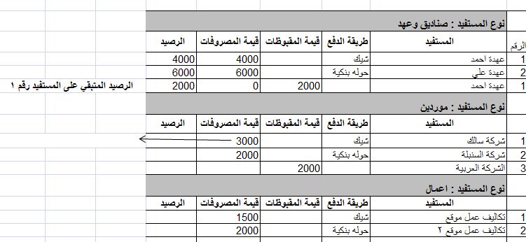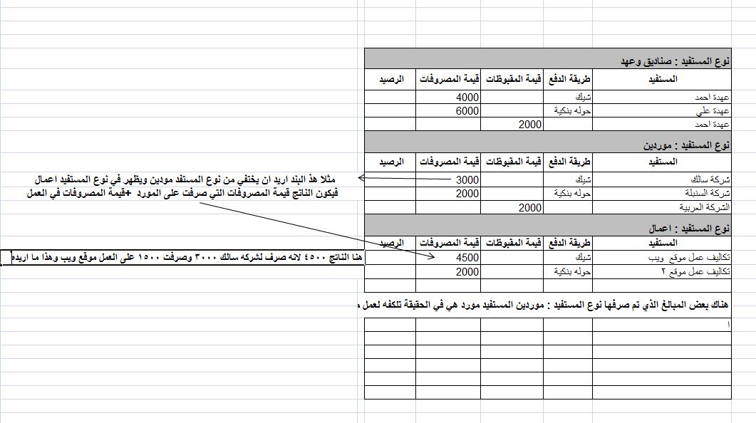 بتاريخ: 7 مايو 201411 سنة كاتب الموضوع comment_250241 ماذا تقصد بالنتيجة لم تكن صحيحة ؟ هل نتيجة عملية الطرح تعطي نتيجة خاطئة ؟؟ تعم تعطي النتيجة خاطئه لانها بنا على خانة المصروف المقابلة فمثلا اذا كان المستفيد رقم 1 صرف له مبلغ 4000 وبعد 10 ايام قام باعاده المبلغ 4000 هنا المفروض ان يكون رصيده هو 0 لانه قام بتصفية عهدته ما يضهر عند هكذا وهذ خطا رقم المستفيد اسم ا لستفيد المقبوض المصروف الرصيد 1 احمد 0 4000 4000 2 علي 500 0 500- 1 احمد 4000 0 4000- اعتقد اذا لم يتكرر رقم المستفيد ستكون النتيجه صحيحه ولكني لا اعرف الطريقه لدمج رقم المستفيد ام هناك طريقه اخرى اخي احمد اشكر جزيل الشكر مهندس احمد تم تعديل 7 مايو 201411 سنة بواسطة anas.soft تقديم بلاغ