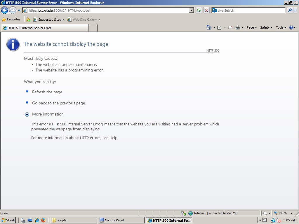بتاريخ: 15 أغسطس 201411 سنة comment_253699 السلام عليكم انا نزلت oracle r12 واشتغل اول مره ودخلت لكن قفلت الويندوز وفتحته لما بدخل علي http://pcs.oracle:8000/ بيفتح ويجيبب http://pcs.ORACLE:8000/OA_HTML/AppsLogin بيجيب 500 Internal Server Error تقديم بلاغ