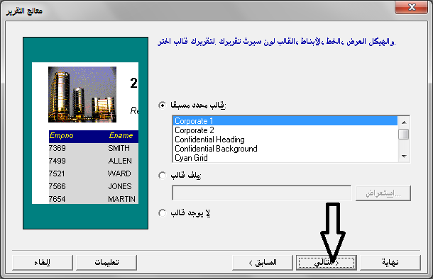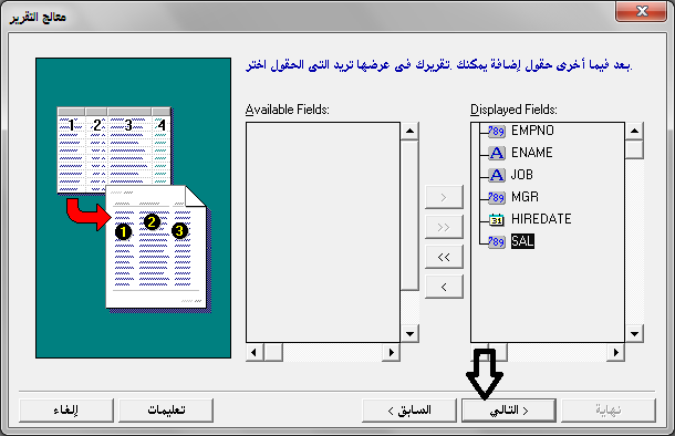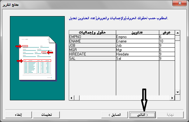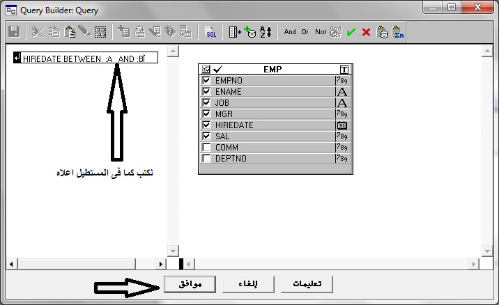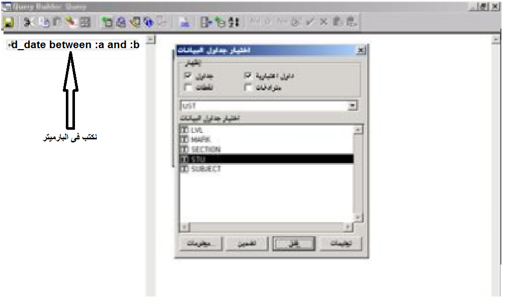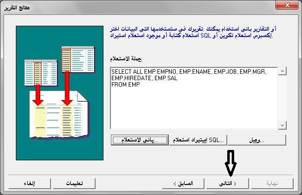 بتاريخ: 8 أكتوبر 201411 سنة comment_255558 بسم الله نبداء اول الخطوات فى تصميم تقرير عن طريق معالج التقارير (Report builder) النقر على معالج التقارير . تظهر لنا نافذة معالج التقارير كما فى الصورة المرفقة . نضغط على التالى حتى نصل الى الشاشة التالية فى نوافذ المعالج. نحتار بانى الاستعلام (Query builder) كما فى الصورة المرفقة والسهم المشار الي رمز بانى الاستعلام تظهر لنا نافذة اسم المستخدم وكلمة المرور ندخل اسم المستخدم وكلمة المرور. تظهر لنا نافذة نجد بها اسماء الجداول التى تم انشاءها داخل sql نحتار الجدول ثم نختار تضمين انظر الصورة المرفقة التالية . فى المستطيل الابيض الذى على اعلى اليمين نكتب d_date between :a and :b بافتراض اننا نريد البحث عن قيم بين تاريخين فى حقل يسمى d_sate الحرف a والحرف هما عبارة عن متغيرات مجهولة سوف يتم التعرف عليهما بواسطة مصدر فى الخطوات القادمة . انظر الصورة المرفقة التالية. سوف اكمل باقى الدروس يوم السبت باذن الله وبالله التوفيق ... تقديم بلاغ