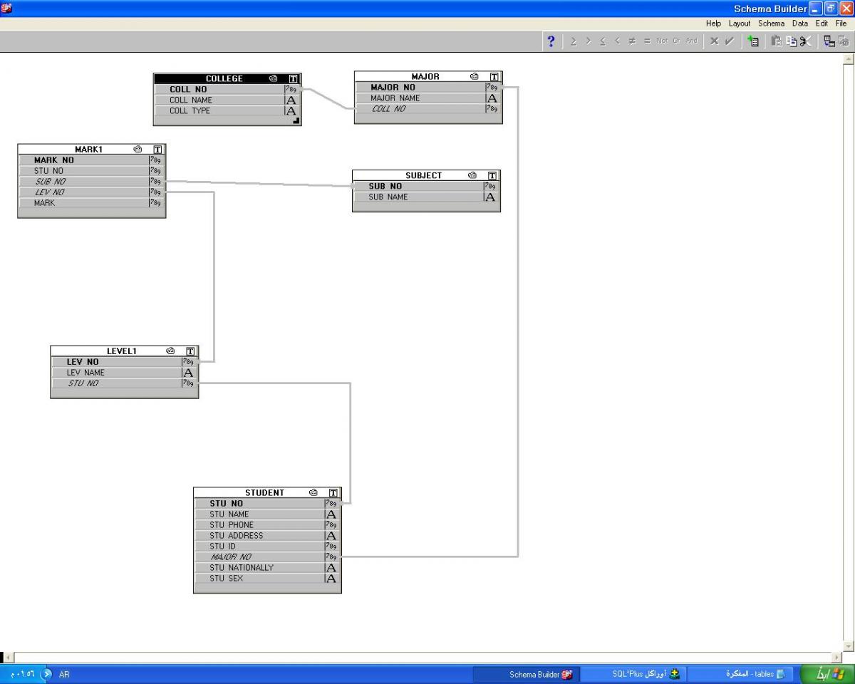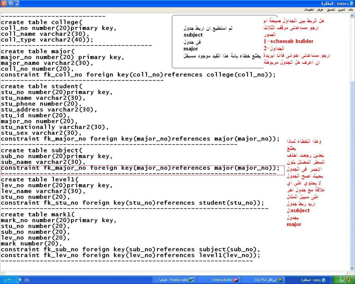 بتاريخ: 8 ديسمبر 201411 سنة comment_257296 اخواني في المنتدي اريد معرفة هل العلاقة بين هذة الجداول صحيحة ام لا وايضاً واجهتني مشكلة في عدم قدرتي علي ربط جدول subject بجدول major الصور التالية تةضح كل شي ارجو المساعدة فاانا اواجهة مشكلة في ربط بين الجداول tables.txt تقديم بلاغ