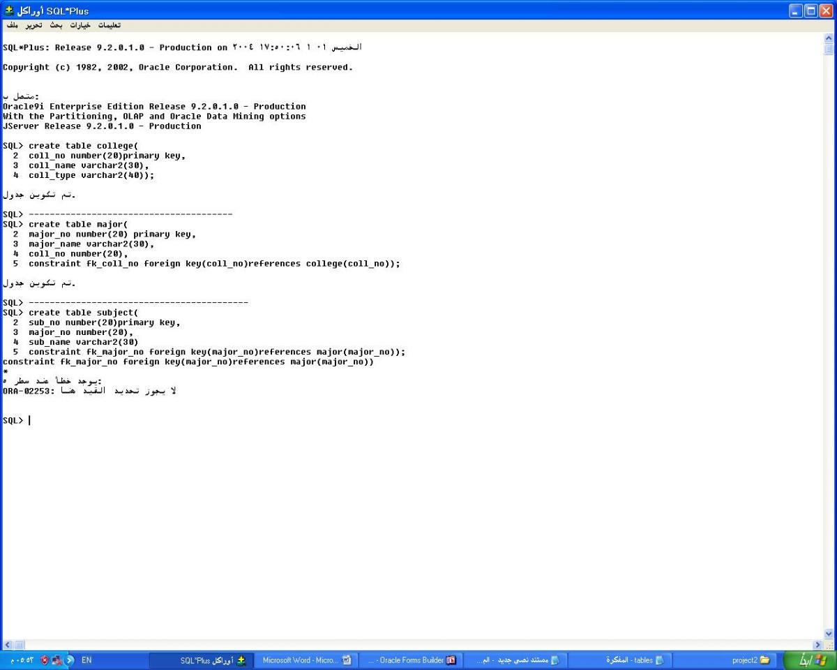 بتاريخ: 13 ديسمبر 201411 سنة comment_257438 أخي العزيز قمت بإضافة رقم التخصص major_no إلي جدول المواد subject لأكن المشكلة هو أنة عندما أقوم بإنشاء جدول جدول الطلاب student تطلع الرسالة الثالثة كما هو موضح في الصورة المرفقة الملاحظة الثانية باايش من جدول اربط جدول الطلاب student أنا هنا ربطة في جدول التخصصات إذا ما في أي إزعاج الرجاء توضح لي كيفه ربط الجداول وهل طريقة ربط الجداول صحيحة أم لا تقديم بلاغ