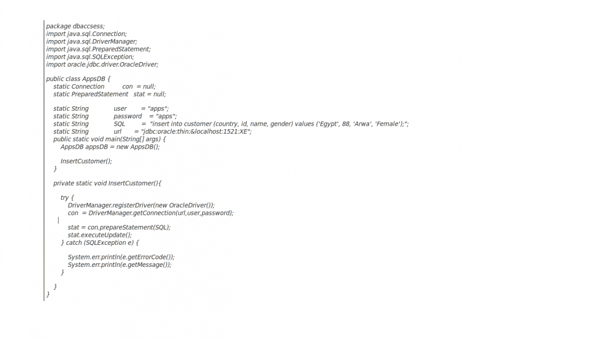 بتاريخ: 9 فبراير 201511 سنة كاتب الموضوع comment_259479 الـ ; نهاية جملة الـ insert لا حاجة لها وهي من يسبب المشكلة يعني هكذا من غير ; قبل " "insert into customer (country,id,name,gender) values('Egypt',88,'Arwa','Female')"; ألف ألف شكر على المساعدة. تقديم بلاغ