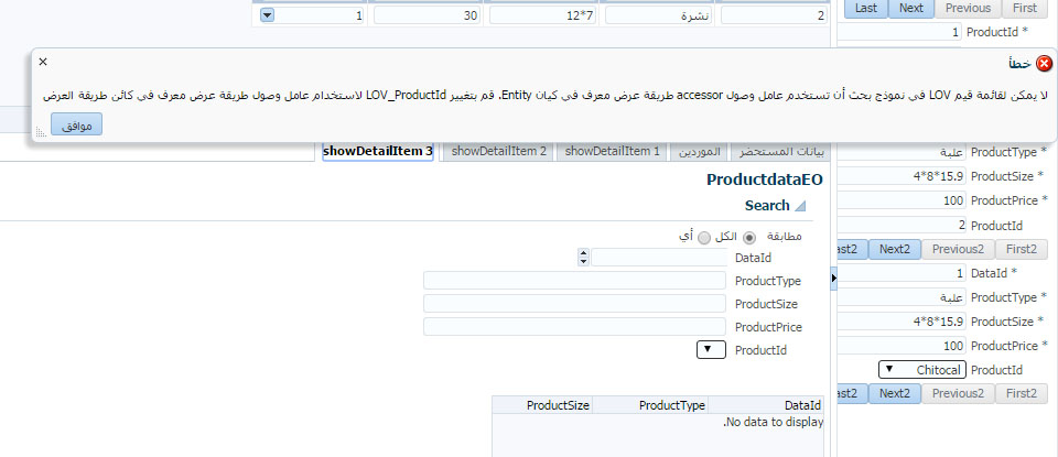 بتاريخ: 19 أبريل 201510 سنة comment_261868 السلام عليكم ورحمة الله ياجماعه رساله الخطأ دى بتظهر لما بعمل رن للصفحه لا يمكن لقائمة قيم LOV في نموذج بحث أن تستخدم عامل وصول accessor طريقة عرض معرف في كيان Entity. قم بتغيير LOV_ProductId لاستخدام عامل وصول طريقة عرض معرف في كائن طريقة العرض] تقديم بلاغ