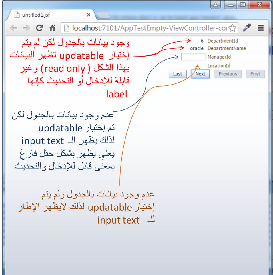 بتاريخ: 8 أغسطس 201510 سنة comment_265159 فقط أردت توضيح هذه الحالة ..عندما تظهر الـ input text هكذا هي موجودة أثناء تنفيذ الصفحة لكن لماذا ظهرت بهذا الشكل كأنها غير موجودة لاتوجد بيانات بالجدول نعم هذا سبب مؤكد لكن مع هذا الـ input text لا تظهر بهذا الشكل بل تظهر بشكل حقل فارغ قابل للإدخال والتحديث ولذلك يوجد سببين أما تم سحب الجدول بشكل read - only او لم يتم وضع البيانات بصيغة updatable أو تم إلغاء التأشير عن Queryable لذلك تظهر الـ input text بشكل كانها label غير قادر على الادخال أو التحديث أي not editable وقد بينت في الصورة المرفقة بمثال صفحة بسيطة أثناء التنفيذ كيف يظهر ما ذكرته في أعلاه وقد غيرت مايلزم لترون الفرق الذي بينته تقديم بلاغ