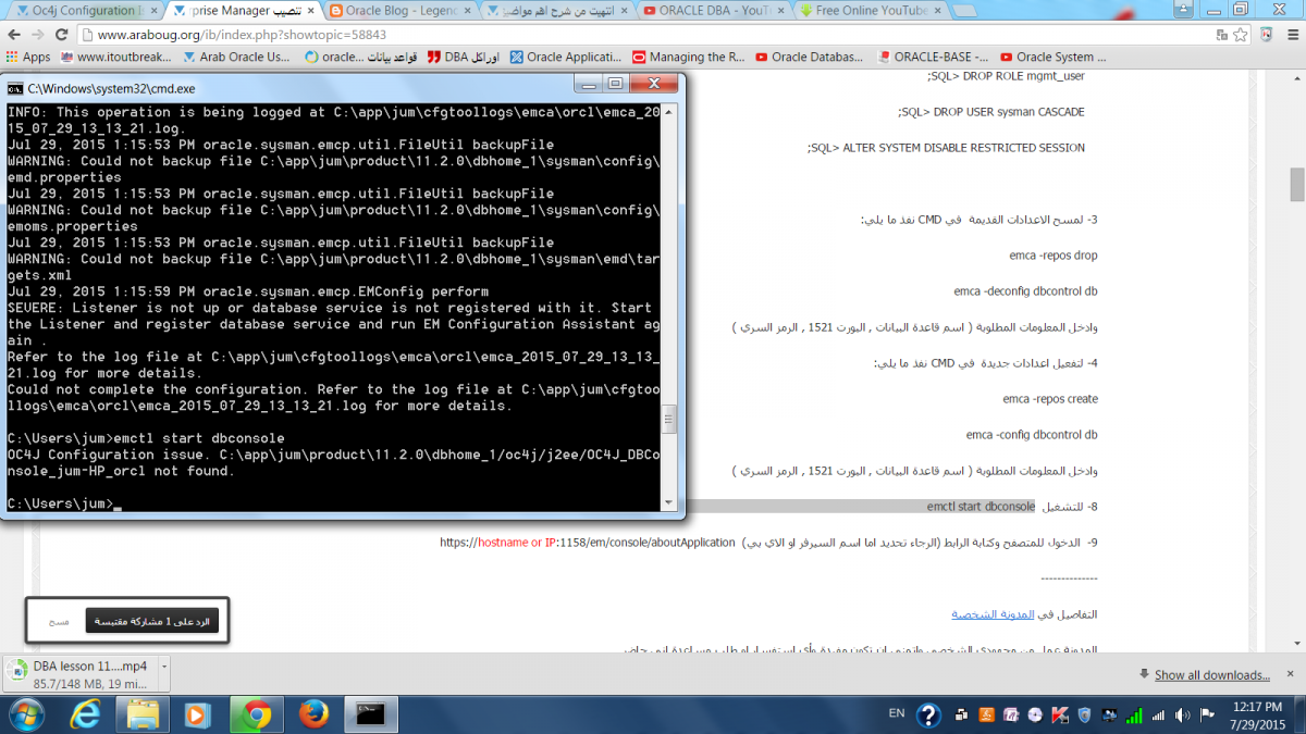 بتاريخ: 29 يوليو 201510 سنة كاتب الموضوع comment_264998 ااC:\Users\jum>emca -config dbcontrol db STARTED EMCA at Jul 29, 2015 1:13:21 PM EM Configuration Assistant, Version 11.2.0.0.2 Production Copyright © 2003, 2005, Oracle. All rights reserved. Enter the following information: Database SID: orcl Listener port number: 1521 Listener ORACLE_HOME [ C:\app\jum\product\11.2.0\dbhome_1 ]: Password for SYS user: Password for DBSNMP user: Invalid username/password. Password for DBSNMP user: Password for SYSMAN user: Password for SYSMAN user: Email address for notifications (optional): Outgoing Mail (SMTP) server for notifications (optional): السلام عليكم هذه الخطوات التى قمت بها ولم اصل الى نتيجة ولدى ملاحظ وهى عندما وصلت الى مرحلة لاسنر Listener ORACLE_HOME [ C:\app\jum\product\11.2.0\dbhome_1 ]: لم اعرف مادا ادخل من بيانات تركها وعملت enter كما فى الشكل الموضح ثم تابعت الخطوات وعملت emctl start dbconsole وكانت النتيجة كما فى الصورة المرفقة يوجد اكثرمن could not ارجو ان اكون قد وضحت الصورة لك ملاجظه لم استطع تحميل الصوره الاولى نظرا لكبر حجمها فعملت copy على الصفحه ولك جزيل الشكر والاحترام تقديم بلاغ