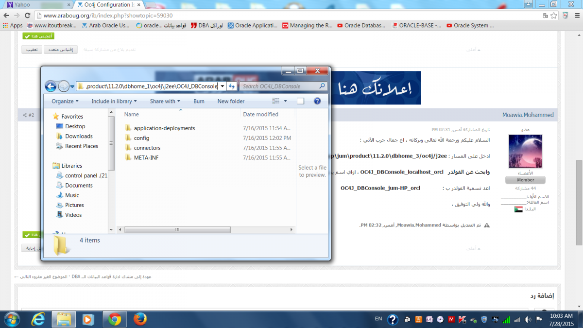 بتاريخ: 28 يوليو 201510 سنة كاتب الموضوع comment_264979 السلام عليكم استادى كبف حالك قد تتبعت المسار الى ان وصلت الى OC4J_DBConsole ولم اجد ملف jum-HP_orcl ولا حتى اى ملف باسم hostname وبحث ايظا فى كل الملفات ولم اجده وهده صورة المسار تم تعديل 28 يوليو 201510 سنة بواسطة jama69 تقديم بلاغ