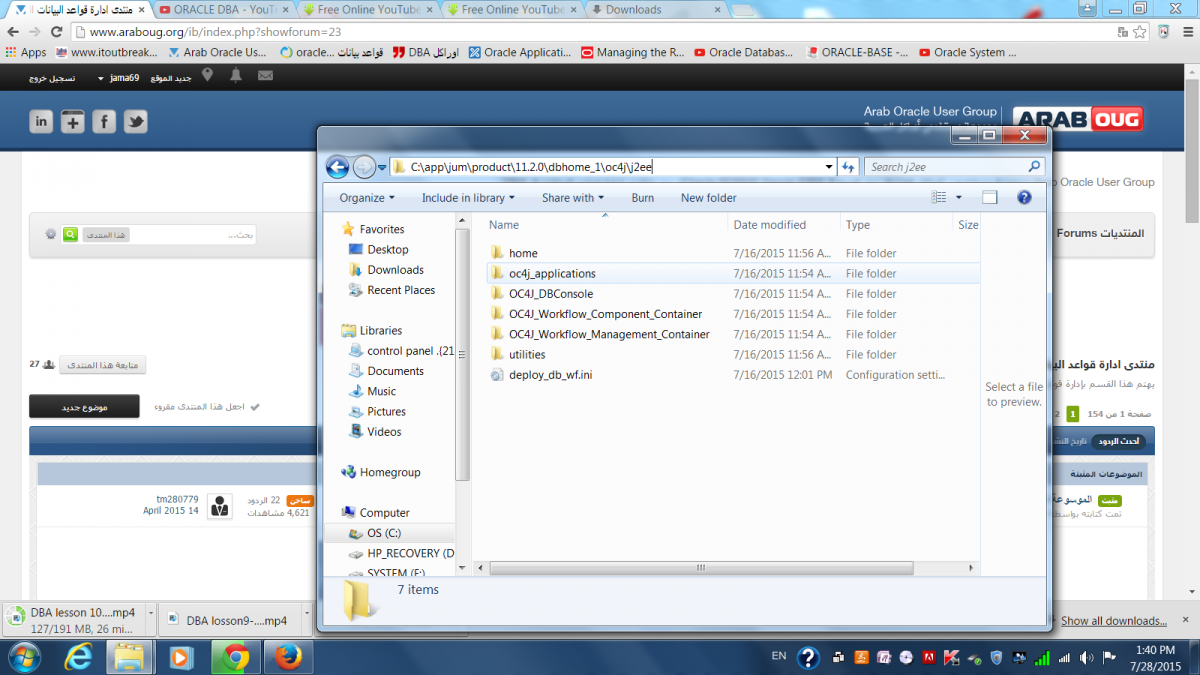 بتاريخ: 27 يوليو 201510 سنة comment_264964 السلام عليكم ورحمة الله تعالى وبركاته ، اخ جمال جرب الآتي : ادخل على المسار : OC4J Configuration issue. C:\app\jum\product\11.2.0\dbhome_3/oc4j/j2ee وابحث عن الفولدر OC4J_DBConsole_localhost_orcl ، اواي اسم يحتوي على hostname اعد تسمية الفولدر ب : OC4J_DBConsole_jum-HP_orcl والله ولي التوفيق ، تم تعديل 27 يوليو 201510 سنة بواسطة Moawia.Mohammed تقديم بلاغ