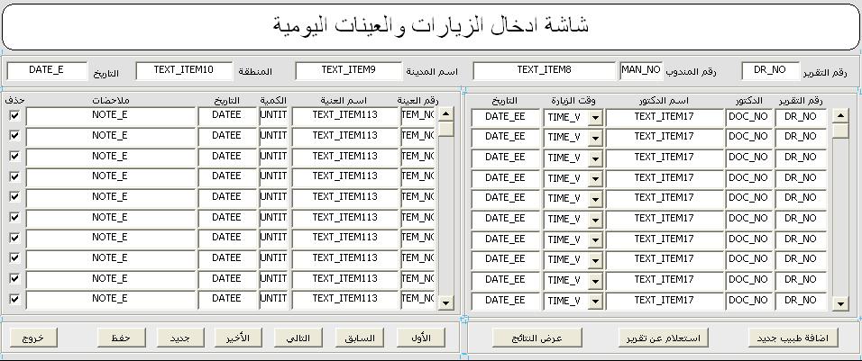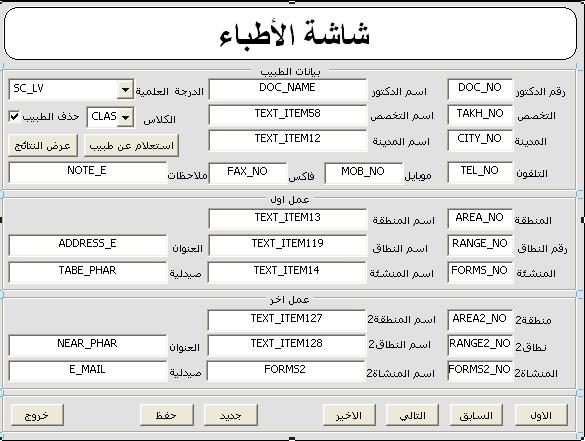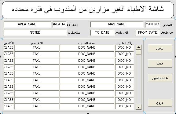 بتاريخ: 31 أغسطس 201510 سنة comment_265676 بسم الله الرحمن الرحيم الاخوه الاعزاء حياكم الله انا عندي في ثلاث شاشات الشاشه الاولى هي شاشه الاطباء وبتم فيها اضافه الاطباء وبياناتهم وهي الشاشه رقم 1 الشاشه الثانيه هي شاشة الزيارات اليوميه وفيها يتم ادخال اسماء الاطباء الذين تمت زيارتهم وهي الشاشه رقم 2 وعندي الشاشه الثالثه وهي التي فيها الكود المطلوب وهي شاشه اريد ان يضهر لي فيها اسماء الاطباء الذين لم تتم زيارتهم ن المندوب المحدد اي اني اريد ان تضهر لي جميع اسماء الاطباء الذين في الشاشه رقم 1 بشرط انهم غير موجودين في الشاشه رقم 2 انا كتبت الكود التالي for i in (select all doc_no from doctors where doctors.status = 0 and doctors.area_no = :dont_visit_up.area_no or doctors.area2_no = :dont_visit_up.area_no and doctors.doc_no not in(select all doc_no from DAILY_DO where DAILY_DO.man_no = :dont_visit_up.man_no and daily_do.date_ee between :dont_visit_up.from_date and :dont_visit_up.to_date) ) loop next_record; :dont_visit_do.doc_no :=i.doc_no; end loop; ولكن الكود يطلع في كل مره اسماء كل الاطباء في شاشه الاطباء مهما غيرت في التواريخ والمندوبين فلا ادري ما الخطى الرجاء المساعده وجزاكم الله خير تم تعديل 31 أغسطس 201510 سنة بواسطة الحكيمي تقديم بلاغ