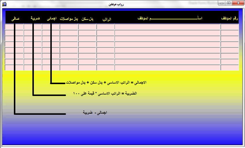 بتاريخ: 15 سبتمبر 201510 سنة comment_266033 (خطوات العمليات الحسابية فى نموذج رواتب ) دالة الاجمالى نحدد عمود اجمالى الرواتب ثم نضغط على مفتاح f4 لعرض خصائص الحقل . من الخاصية calculation نحتار formula . فى اسفل السطر نجد الخاصية formula نكتب التالى . sal: + :bs + :bm: فى السطر 4 نفترض ان sal هو الراتب و bs هو بدل سكن و bm هو حقل بدل مواصلات . دالة الضريبة نحدد حقل الضريبة ثم نضغط على مفتاح f4 لعرض خصائص الحقل . من الخاصية calculation نحتار formula . فى اسفل السطر نجد الخاصية formula نكتب التالى . sal:*2/100: بمعنى استقطاع 2% من الراتب دالة صافى الراتب نحدد حقل الصافى ثم نضغط على مفتاح f4 لعرض خصائص الحقل . من الخاصية calculation نحتار formula . فى اسفل السطر نجد الخاصية formula نكتب التالى sal - : tax: تقديم بلاغ