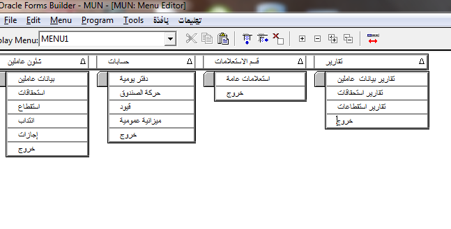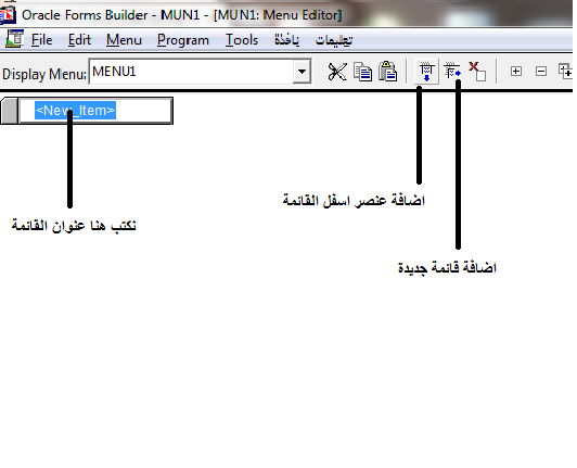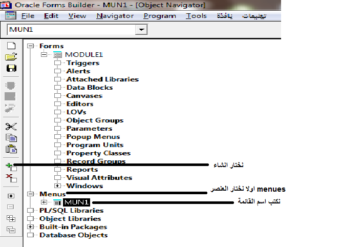 بتاريخ: 16 سبتمبر 201510 سنة comment_266059 إنشاء القوائم فى Form Builder فتح نافذة form builder ثم نضغط على مفتاح f3 تظهر لنا نافذة تسمى Opiect Navigator تختار menus ثم نختار العنصر create من مربع الادوات وهو فى شكل علامة + انظر الشكل التالى . تم تعديل 16 سبتمبر 201510 سنة بواسطة همس السحر تقديم بلاغ