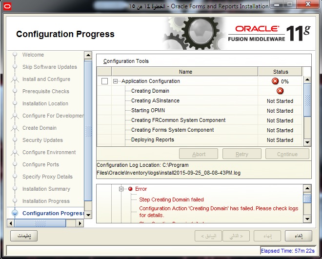 بتاريخ: 25 سبتمبر 201510 سنة comment_266215 السلام عليكم ورحمة الله وبركاته وكل عام والجميع بخير الويندوز عندي 7 64 نزلت الاوراكل داتابيز 11g2 ونزلت الويب لوجيك 1036 جنيريك ولما جيت انزل الفورم اند ريبورتز كل شيء تمام بس لما اجي عالمرحله الثانية اللي هي configration calssic تبدأ عندي المشكله وهي كالتالي : creating domain failed ولما افتح اللوقو يطلع لي كلام مكرر لا اعلم مالمقصود به دخلت صفحات المساعده في موقع الاوراكل وعلى النت في جوجل لكن للأسف ما وجدت حل لمثل هذه المشكله علما بأن الـ node manager يكون واقف عندي يعني مش شغال تقديم بلاغ