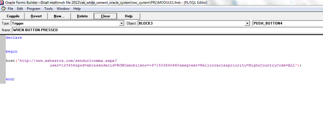 بتاريخ: 4 نوفمبر 201510 سنة comment_267363 لدي شاشة لتسجيل حركة اجازات موظفين مثلا واريد ارسال رساله نصيه للموبايل عند تسجيل كل حركة تم الاستراك مع شركه sms لارسال الرسائل وتم تزويدي بالكود الخاص لذلك عند تنفيذ الكود من شاشة الاوراكل فانه يعطي تم الارسال للمسج لكن فعليا لا يتم ارسالها ولكن عند تنفيذ نفس الكود على انترنت اكسبلورر فانه يتم ارسال الرساله مباشره الكود هو مثلا كالتالي كما في الملف المرفق للتوضيح declare begin ?host('http://www.mshastra.com/sendurlcomma.aspx ;('user=123456&pwd=abcd&senderid=Roma&mobileno=+971503640660&msgtext=Hellooracle&priority=High&CountryCode=ALL end; الكود مطبق على اوراكل 10 لكن هل يوجد اي مشكله بالكود اعلاه في اوراكل فورم 6i او هل من طريقه لاستدعاء الكود من خلال function في DB تم تعديل 4 نوفمبر 201510 سنة بواسطة mm_alraie تقديم بلاغ