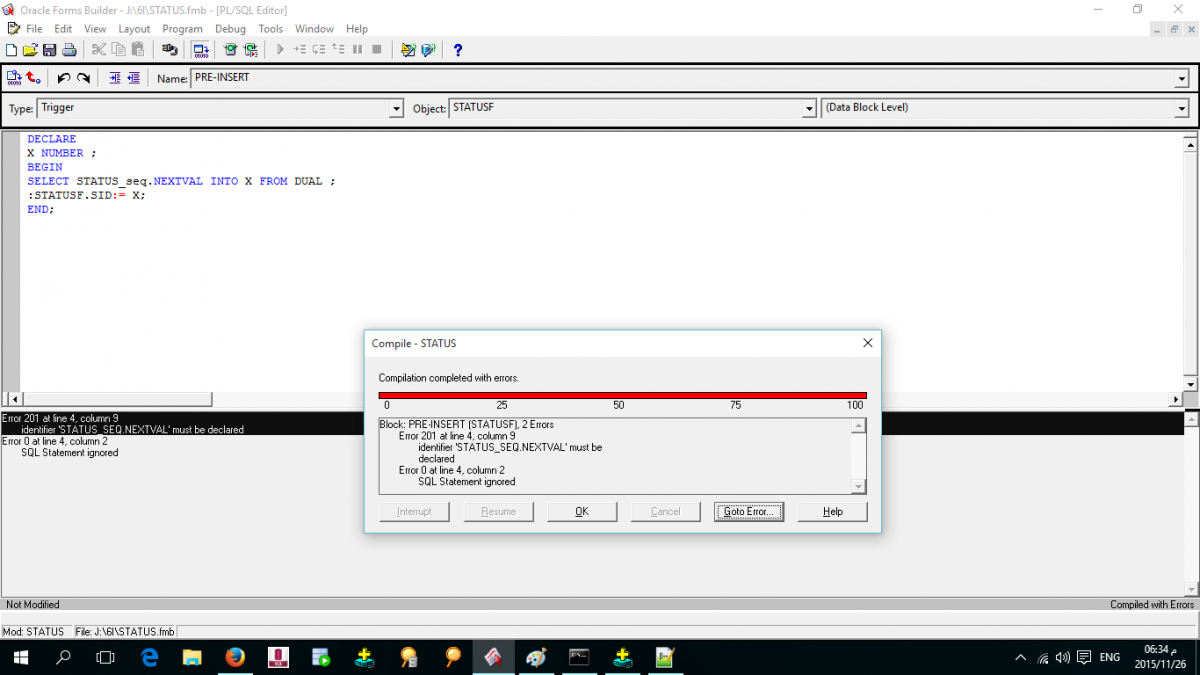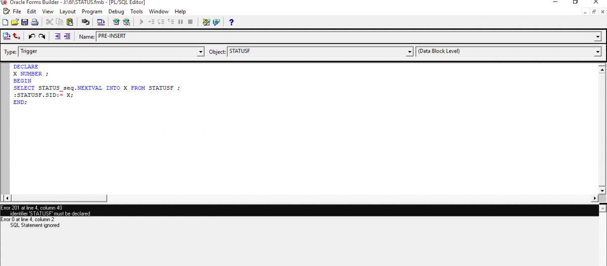 بتاريخ: 26 نوفمبر 201510 سنة comment_268060 السلام عليكم ورحمة الله وبركاتة اخوانى الكرام عندى مشكلة لما اجى اعمل COMPILE بيظهر الرسالة المرفقة الاصدار 10G مع العلم انها شغاله على 6I كويس اتمنى الافادة DECLARE X NUMBER ; BEGIN SELECT STATUS_seq.NEXTVAL INTO X FROM STATUSF ; :STATUSF.SID:= X; END; تم تعديل 26 نوفمبر 201510 سنة بواسطة ميسم الكرام تقديم بلاغ