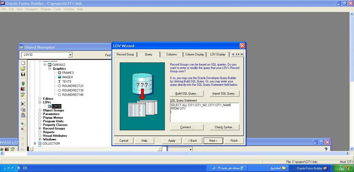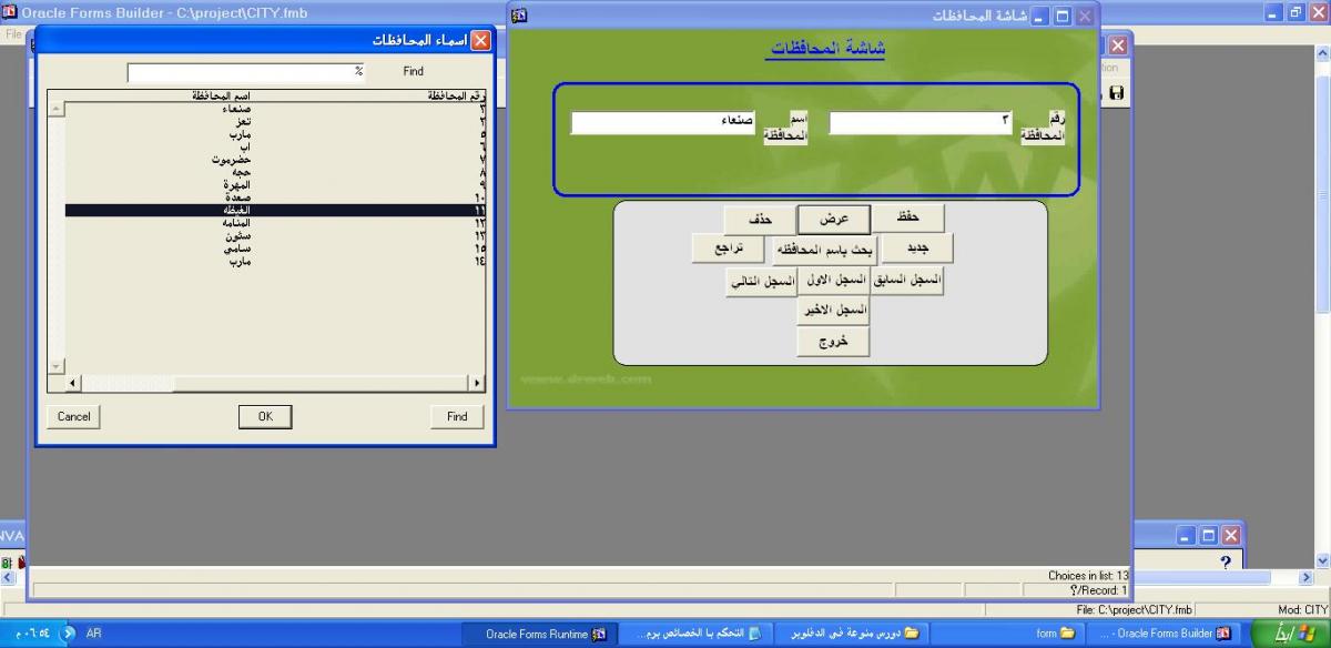 بتاريخ: 6 ديسمبر 201510 سنة comment_268533 افتح خصائص ال ( property palette (LOV اذهب الى column mapping properties ستفتح لك نافذة بها اسماء الحقول المستعلم عنها من قاعدة البيانات اقف بالماوس عند الحقل المراد ربطه بمربع النص لديك في الفورم ثم انزل تحت من ال return item إضغط على browse ستفتح لك نافذة منها قم بتحديد مربع النص المراد ربطه بالحقل في ال LOV مثلا : Name مع Block.Name كرر هذه العملية على حسب على الحقول المراد ربطها بال LOV بمعني : عند الضغط على حقل معين في ال LOV سيتم ملء الحقول في البلوك بناءً على الريكورد الذي تم الضغط عليه في ال LOV اتمنى ان يساعدك هذا تقديم بلاغ