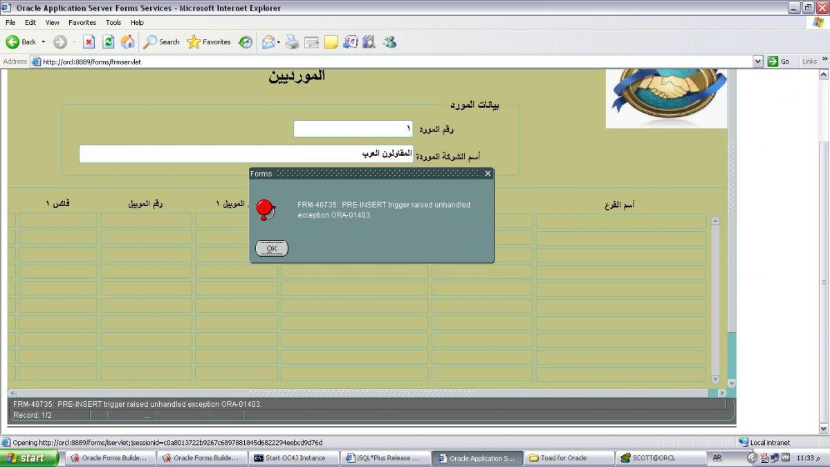 بتاريخ: 27 يناير 201610 سنة comment_270759 في الـ trigger أسمه Pre_insert على مستوى الفورم وكاتب فيه الأتي ;select supplier_seq.nextval into :suppliers.supplier_id from suppliers where supplier_id = :suppliers.supplier_id ;select company_seq.nextval into :companies_suppliers.company_id from companies where company_id = :companies_suppliers.company_id Too many raws-- ;select branch_seq.nextval into :branchs_suppliers.branch_id from branchs where branch_id = :branchs_suppliers.branch_id ;commit ويظهر لي هذا الخطاء عند ال run للفورم ولا يتمم عملية الـ insert .فماذا أفعل تقديم بلاغ
