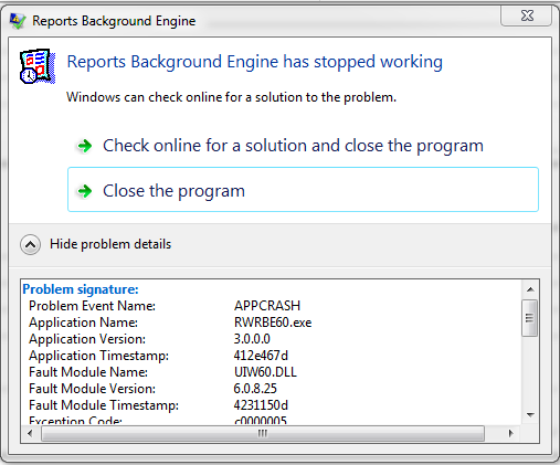 بتاريخ: 12 مايو 20169 سنة comment_274559 السلام عليكم ورحمه الله وبركاته ,,اخوتي اعضاء المنتدى الكرام ثمه عندي مشكله في عرض تقرير 6i فعند عرض التقرير يقوم بالعرض لثواني ثم تظهر مشكلة عند تكبير التقرير او تحريك السكرول والمشكله كما في الصورة المرفقه Problem signature: Problem Event Name: APPCRASH Application Name: RWRBE60.exe Application Version: 3.0.0.0 Application Timestamp: 39c93f66 Fault Module Name: UIW60.DLL Fault Module Version: 6.0.8.25 Fault Module Timestamp: 4231150d Exception Code: c0000005 Exception Offset: 0004bca0 OS Version: 6.1.7600.2.0.0.256.1 Locale ID: 1025 Additional Information 1: 0a9e Additional Information 2: 0a9e372d3b4ad19135b953a78882e789 Additional Information 3: 0a9e Additional Information 4: 0a9e372d3b4ad19135b953a78882e789 Read our privacy statement online: http://go.microsoft.com/fwlink/?linkid=104288&clcid=0x0409 If the online privacy statement is not available, please read our privacy statement offline: C:\Windows\system32\en-US\erofflps.txt تقديم بلاغ