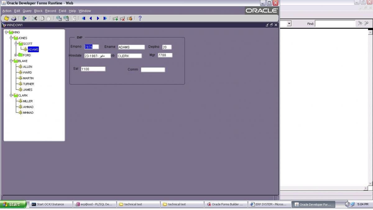 بتاريخ: 12 يوليو 20169 سنة comment_276451 على كل حال ستجد في هذا المثالين السابقين ما تريد اول مثال عبارة عن tree تظهر كل من مدير وتحته الموظف الذي يتبع له بما في ذلك المدير العام عند الضغط دبل كليك على الي نود بالتري تظهر معلومات الموظف --------------------- المثال الثاني هو عبارة عن tree تظهر كل قسم وتحته الموظفين الذين يتبعون لذلك القسم عند الضغط على أي قسم تظهر معلومات القسم وتحته معلومات الموظفين الذين يتبعون للقسم ملاحظة: يوجد ضمن الملفات المرفقة ملف يحتوي على تعليمة انشاء view للفورم الثاني يجب تنفيذها اولا --------------------- المثالي تم بناؤهم على مستخدم scott/tiger على جداول emp - dept يوجد صور مرفقة لنتيجة الفورم بالتوفيق Tree examples.rar تقديم بلاغ
