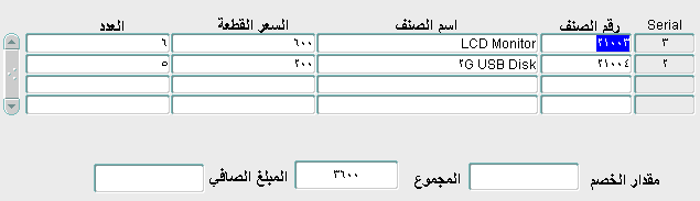 بتاريخ: 1 أغسطس 20169 سنة comment_276804 على افتراض ان لديك جدولين الأول جدول الفاتورة Bills يحتوي على ( رقم الفاتورة ، تاريخها ، العميل ، المبلغ ..... الخ ) والثاني جدول الأصناف Items ويحتوي على ( رقم الفاتورة Bill_no ، رقم التسلسل ، رقم الصنف ، اسم الصنف ، .... الخ) يربط بينهما رقم الفاتورة حيث ، رقم الفاتورة في جدول الأصناف مرتبط برقم الفاتورة في جدول الفواتير فعند اضافة الاصناف ومعرفة التسلسل استخدم الاستعلام التالي select nvl(Max(رقم_التسلسل),0) +1 from جدول_الأصناف where رقم_الفاتورة = :رقم_الفاتورة في الفورمة هكذا select max(nvl(Serial,0)) +1 into :serial from Items where Items.Bill_no = :Bill_no وشكراً تم تعديل 1 أغسطس 20169 سنة بواسطة Faisal Matari تقديم بلاغ