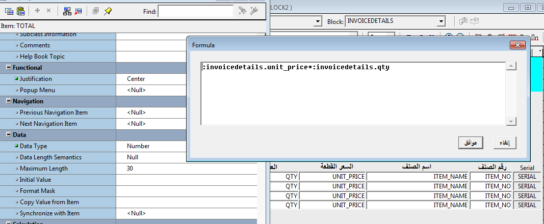 بتاريخ: 31 يوليو 20169 سنة comment_276798 السلام عليكم ورحمة الله استخدم امر ال max على رقم التسلسل واضف اليه + 1 وذلك بمعلومية رقم الفاتورة بدلا من استخدام ال sequence مع ملاحظة أن يتم تنفيذ الأمر مع trigger pre insert ويتم كتابة الأمر على مستوى البلوك block ------------ المسألة الثانية عرف حقل جديد ليس نوعه database item يحتوى ناتج ضرب الكمية * السعر ------------ ثم اعمل تجميع لقيم الحقل الجديد من الخصائص كالتالي طريقة اجراء عملية اجمالى حقل معين فى فورم تابلور1-انشاء display itemوتقوم بتغير خصائصه كالتالى2-data type الى نمبر3-database item الى no4-number of item displayed الى 1 بدلا من صفر5-calculation mode الى summary6-summary function الى sum7-summarized block الى اسم البلوك الموجود عندك8-summarized item اختار اسم الحقل المراد جمعه.اخر حاجة تغير خاصية البلوك التى اسمها query all records الى yes تقديم بلاغ