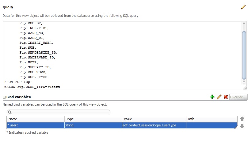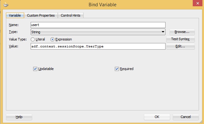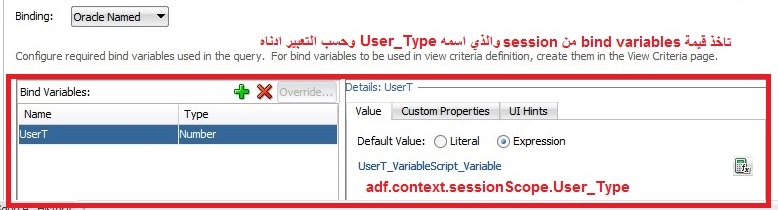 بتاريخ: 26 سبتمبر 20178 سنة comment_290358 حسناً قم بعمل method واكتب داخلها الكود ثم استدعيها في خصائث bind variable السلام عليكم استاذ مصطفى قمت بكتابة method وعملت bind variables وعملت على الاصدار 11جي ولم تعمل لدي حيث وجدت الطريقة على المدونة http://nitesh-java.blogspot.com/2014/11/setting-session-scope-variable-to-adf.html تم تعديل 26 سبتمبر 20178 سنة بواسطة محمد_العراقي تقديم بلاغ