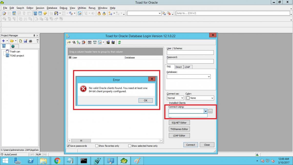 بتاريخ: 10 مارس 20179 سنة كاتب الموضوع comment_284041 جزاكم الله خيراتم بحمد لله ..المشكله الانان التود لا يحس بوجود$ORACLE_HOMEعلما بأنها معرفة فيregedit TNS_ADMIN had defined in System EnvTNS_ADMIND:\oracle\product\10.2.0\db_1\network\ADMIN ولكن لا يزال التو يصدر مشكله toad 12 no valid oracle client found انني ابحث عنoracle client 10g 64 bit windows server 2012 r2 ام هل هناك حل ابسط ؟ تقديم بلاغ