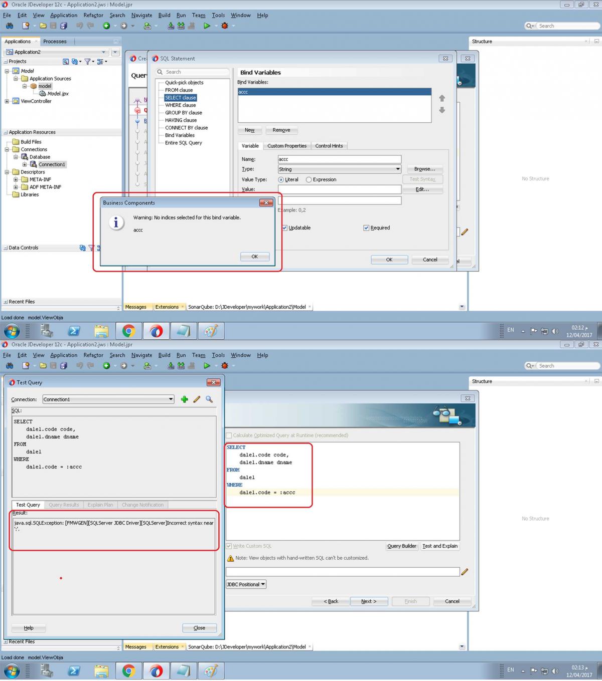 بتاريخ: 13 أبريل 20178 سنة كاتب الموضوع comment_285682 انا كتبت جمله query كالتالي SELECT dalel.code code, dalel.dname dname FROM dalel WHERE dalel.code = ? or dalel.code = ? وعند الضغط على Test and explain لا يوجد مشكله وكله تمام وتم اضافه 2 Binding Variables مثال acc String abb String ولكن عند عمل Run App module تظهر هذه الرساله SQL error during statement preparation. Statement: SELECT dalel.code code, dalel.dname dname FROM dalel WHERE dalel.code = ? or dalel.code = ?: [FMWGEN][sqlServer JDBC Driver]Invalid parameter binding(s). تقديم بلاغ