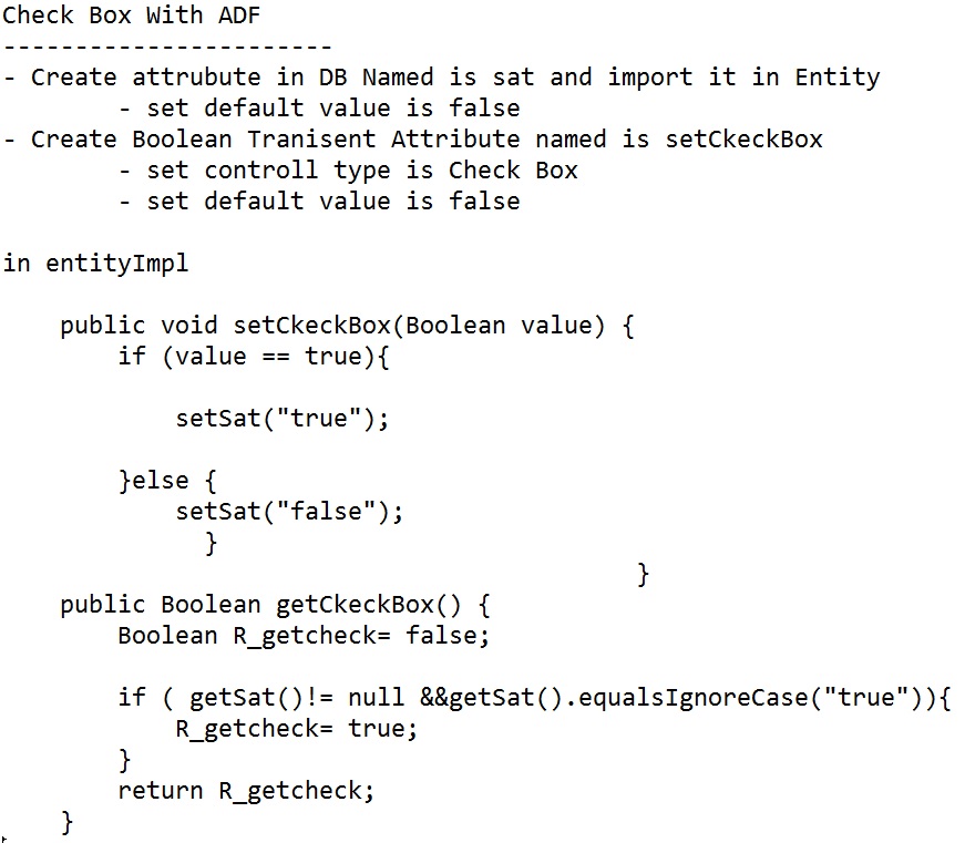 بتاريخ: 25 أبريل 20178 سنة كاتب الموضوع comment_286089 لتشغيل ال CHECK BOX كتابة الكود التالى فى ViewRowIemlp public Boolean getCHECK_VAL() { // return (Boolean) getAttributeInternal(CHECK_VAL); if(this.getDEL_YN() !=null && this.getDEL_YN().equals(0)) { return true; } return false; } public void setCHECK_VAL(Boolean value) { // setAttributeInternal(CHECK_VAL, value); System.out.println("Boolean value= "+value); if(value) { System.out.println("after valueBoolean value"); Number ii= new Number(0); this.setDEL_YN(ii); } else { System.out.println("after value2 Boolean value"); Number ii= new Number(1); this.setDEL_YN(ii); System.out.println("after value2 Boolean value "+getDEL_YN()); } } واششتغلت بعد ال CHECK BOX فى اريد اتنفيذ هذا الكود لتنفيذ هذه الكود ( بنادى على Entity validation ) public boolean validateCHECK_VAL(Boolean check_val) { System.out.println("validateCHECK_VAL_validateOrdpayment"); validateOrdpayment(); return true; الكود الاخير لا يعمل } تقديم بلاغ