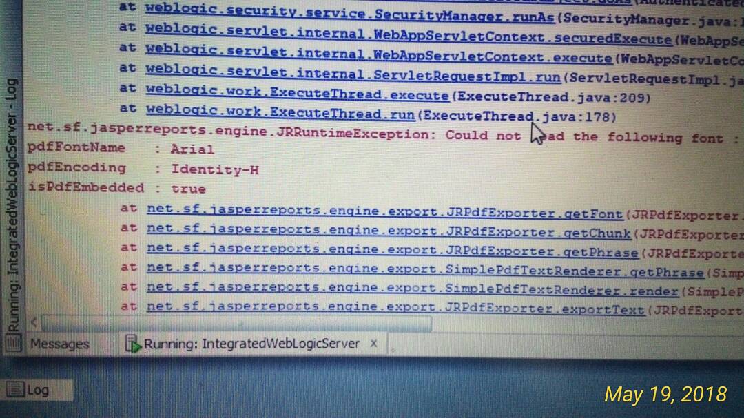 بتاريخ: 19 مايو 20187 سنة comment_295374 السلام عليكم : عند استدعاء تقرير من اجل عرضه في المتصفح تظهر المشكلة الموضحة بالصورة علما ان التقرير يعمل في Jasper Ireport بالشكل المطلوب .. وقد تم إضافة نوع الخط Arial في ضمن مكاتب ال jdeveloper تقديم بلاغ