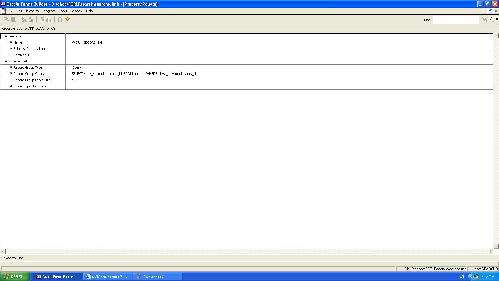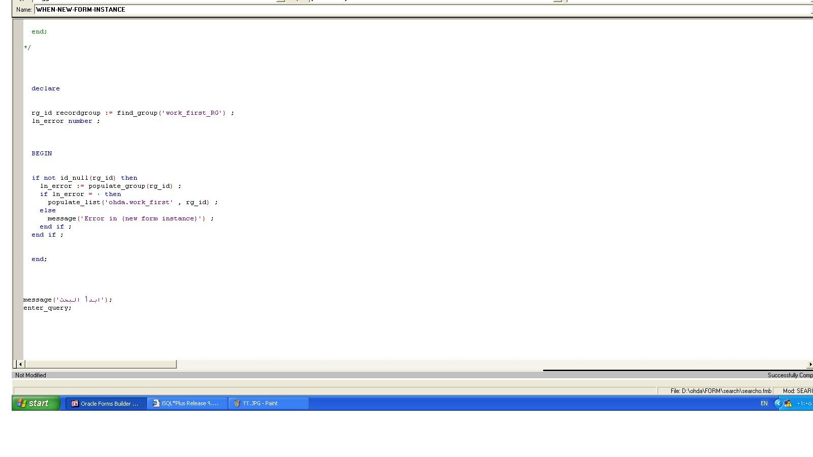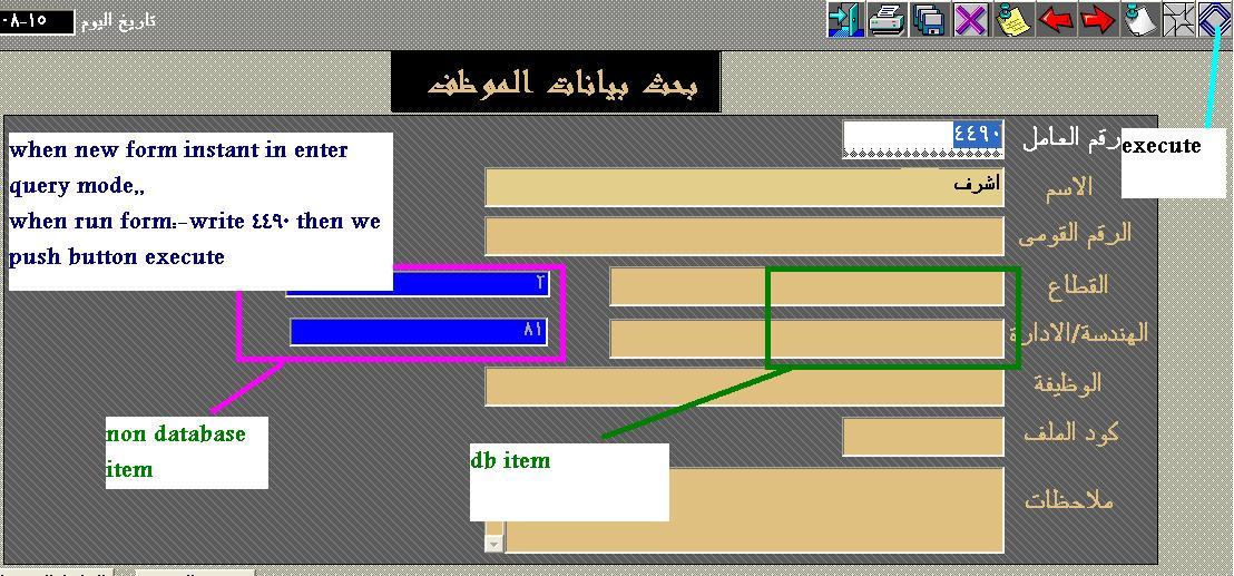 بتاريخ: 17 أغسطس 20196 سنة كاتب الموضوع comment_298915 الفورمة بتبدا فى enter query mode لما ابدا استعلم بكتب رقم العامل ثم زر استعلام اللى فى تولبار اللى انا عاملاه فوق يظهر الداتا كما فى الصورة (بدون اسم القطاع و الادارة)فى non db items رغم ان اكوادهم ظاهره فى db items عفوا...مكان db item & non db item معكوس فى الصورة تم تعديل 17 أغسطس 20196 سنة بواسطة Fabulous تقديم بلاغ