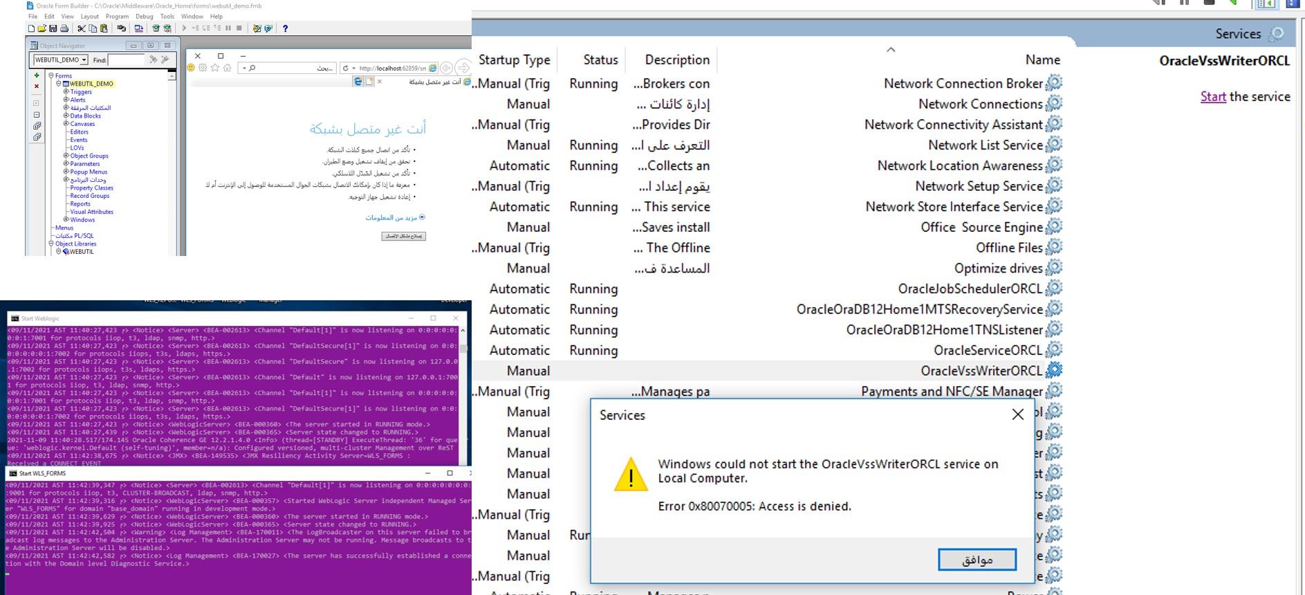 Sadeqezzan بتاريخ: 10 نوفمبر 2021 تقديم بلاغ مشاركة بتاريخ: 10 نوفمبر 2021 المهندس محمود سؤالي سطبت اوراكل 12c كامل مع البلوجك والفورمز والريبورت وشغلت ال weblogic وعملت run للفورمه شغال ب explorer ال JdK 271 ثم نزلت apex 21.2 مع ords وقمت بتثبيته كل شي برضو تمام ثم قمت بتنزيل tomcat9 و عملت start ال jdk211 على chrome فالاخير ما يررن ال explorer ولا الكروم فتح ابكس والسيرفرات شغاله عدا الاخير كما موضح بالصوره للمعلومه حذفت tomcat رجع الوضع طبيعي ترن الفورمه اقتباس رابط هذا التعليق شارك المزيد من خيارات المشاركة