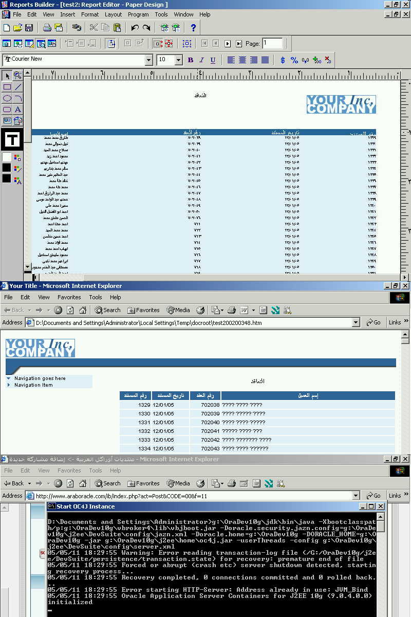 بتاريخ: 11 مايو 200520 سنة comment_35918 مرفق صورة لشكل التقرير فى Design Time And Run Time1- البيانات تظهر سليمة أثناء التصميم 2- هل الجزء الثانى من الشكل صحيح (يظهر هذا الشكل عند عمل Run for the report)3- يظهر فى الجزء الثالث من الصورة شكل OC4Jما هو المطلوب لكى يعمل التقرير بالشكل الصحيح مع العلم انة يوجد على جهازى Tomcat 5ملحوظة:لا يوجد لدى Oracle Application Server تم تعديل 11 مايو 200520 سنة بواسطة sakr_orcl تقديم بلاغ
