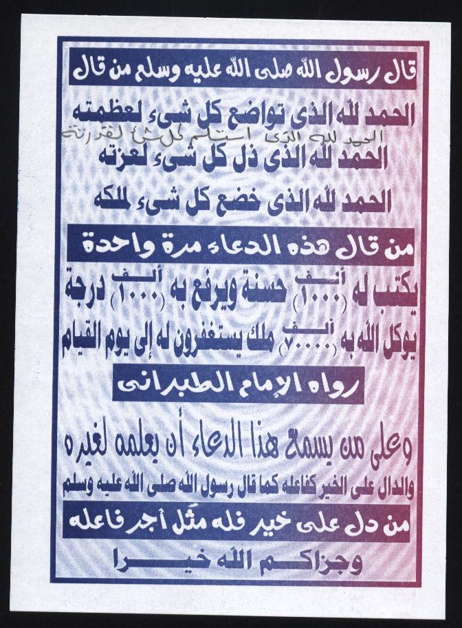 بتاريخ: 16 مايو 200520 سنة comment_36423 بسم الله الرحمن الرحيم السلام عليكم ورحمة الله وبركاته،، يكتب له 1000 حسنة ويرفع لة 1000 درجةيوكل الله لة 70000 مللك يستغفرون له الى يوم القيمةالحمد لله الدي توضع كل شء اعظمتةالحمد لله الدي استلم كل شىء لقدرتةالحمد لله الدي دل كل شىء اعزتةالحمد لله الدي خضع كل شىء للملكه تقديم بلاغ