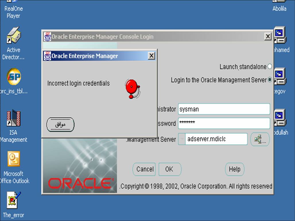 بتاريخ: 31 مايو 200520 سنة comment_37831 قمت بإتباع ما ذكر بالتفصيل عن الـ ORACLE MANAGEMENT SERVERhttp://www.araboug.org/ib/index.php?showtopic=6984ولكن ظهرت لي هذه الرسالة :- تقديم بلاغ